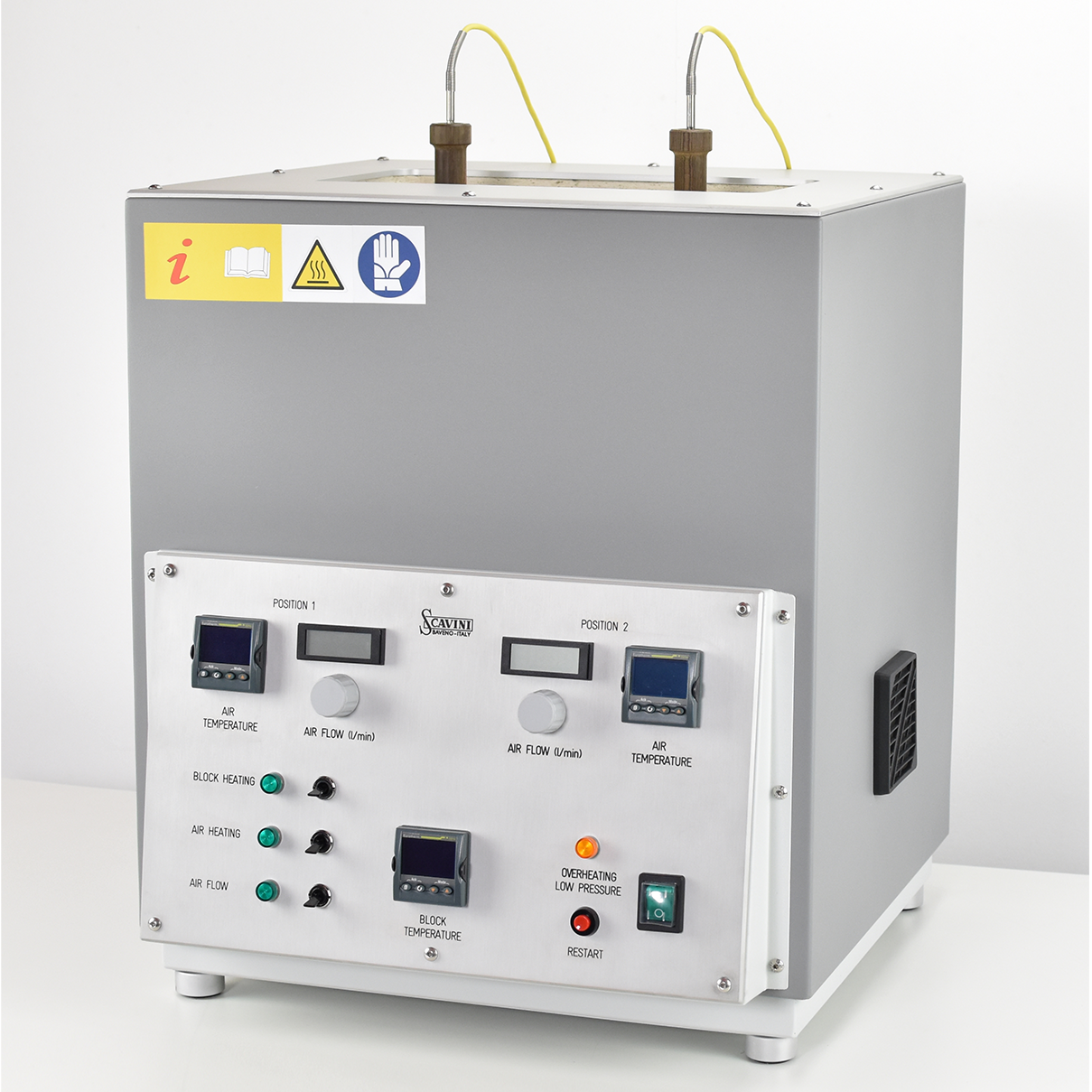It features a benchtop steel case with high-efficiency thermal insulation, an aluminum block with air preheaters, and stainless steel band heaters. The control panel includes independent thermoregulators for both the block and air, digital displays, and knobs for precise flow adjustment. The test range is from ambient temperature up to 316°C, with safety devices to prevent overheating. It also has electronic mass flow controllers with 1% accuracy and a microprocessor thermoregulator with 0.1°C precision. The unit includes safety features, a user manual, and is CE marked. Available in two and four-place models, it operates on 220 V/50 Hz, with power consumption options of 2000 W or 4000 W.