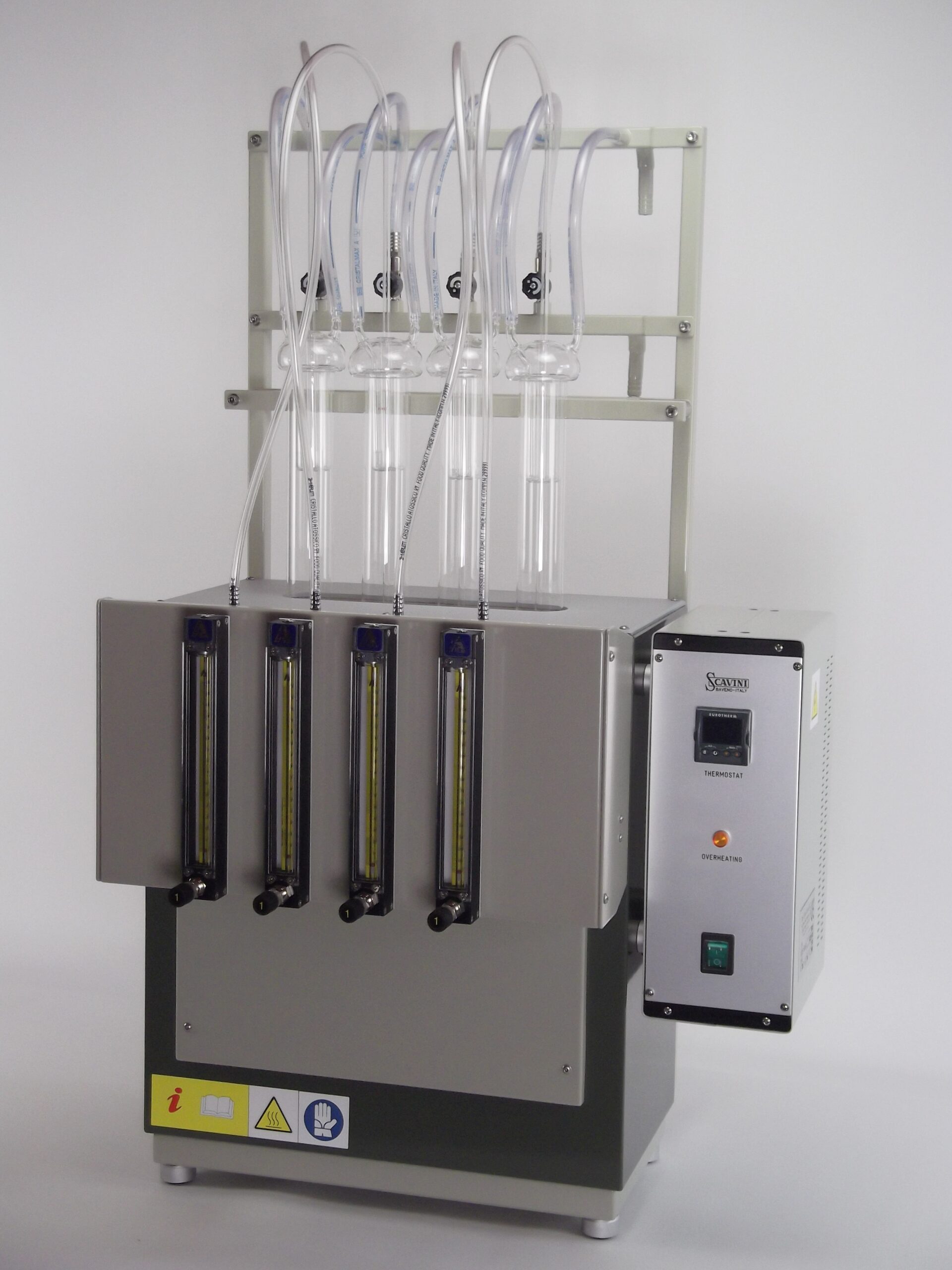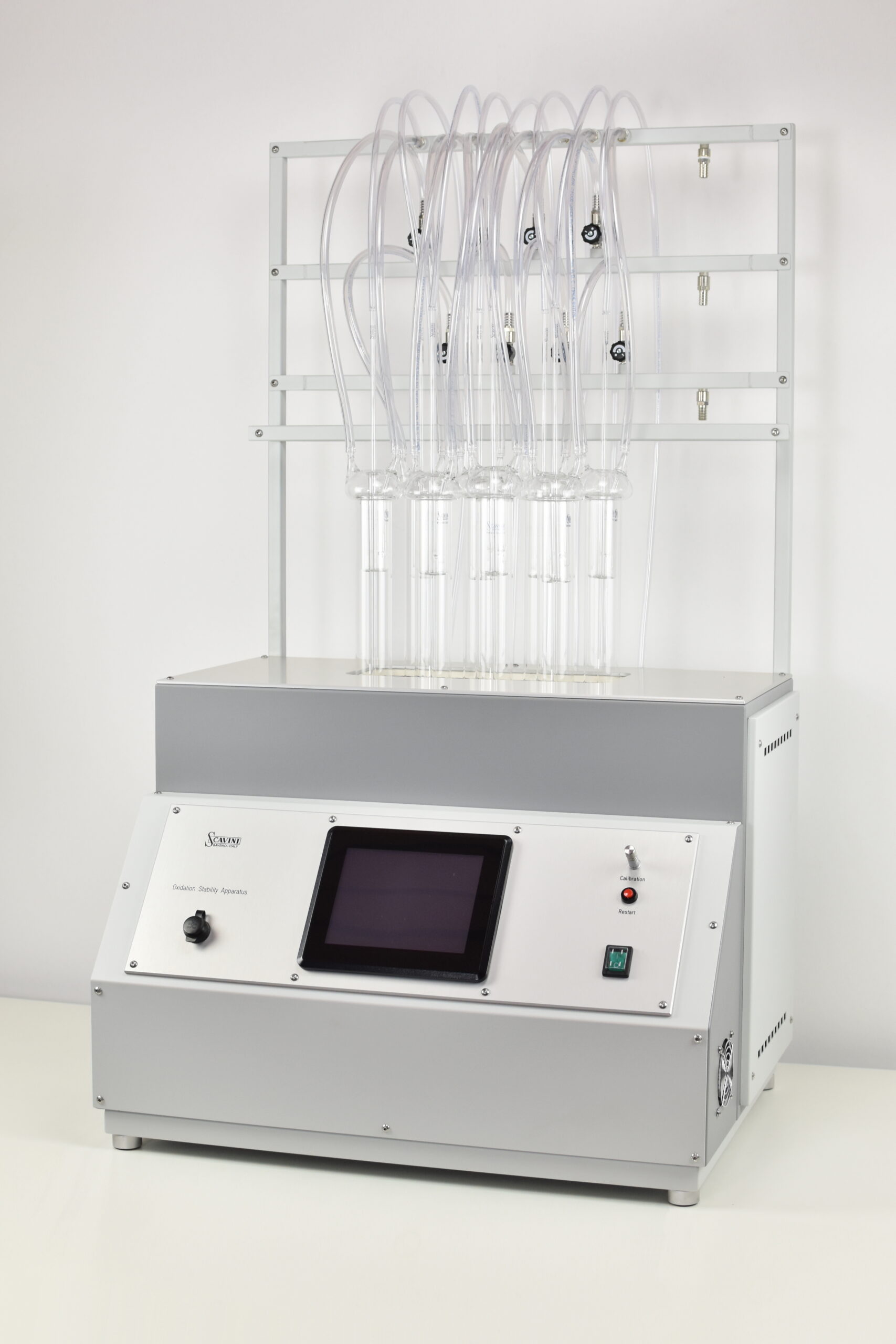 The Apparatus for Determining Oxidation Characteristics of Inhibited Mineral Oils is designed to evaluate lubricant oxidation stability in accordance with ASTM D943, IP 157, ISO 4263, and ISO 12205. Housed in a durable benchtop steel enclosure, the system features an aluminum thermostatic block accommodating four, eight, or twelve oxidation cells, each with independent flow control.