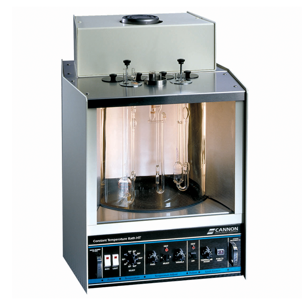 - Seven glass viscometer ports (each 2” in diameter) and two thermometer ports (each 0.4” in diameter) allow up to 7 simultaneous viscosity determinations