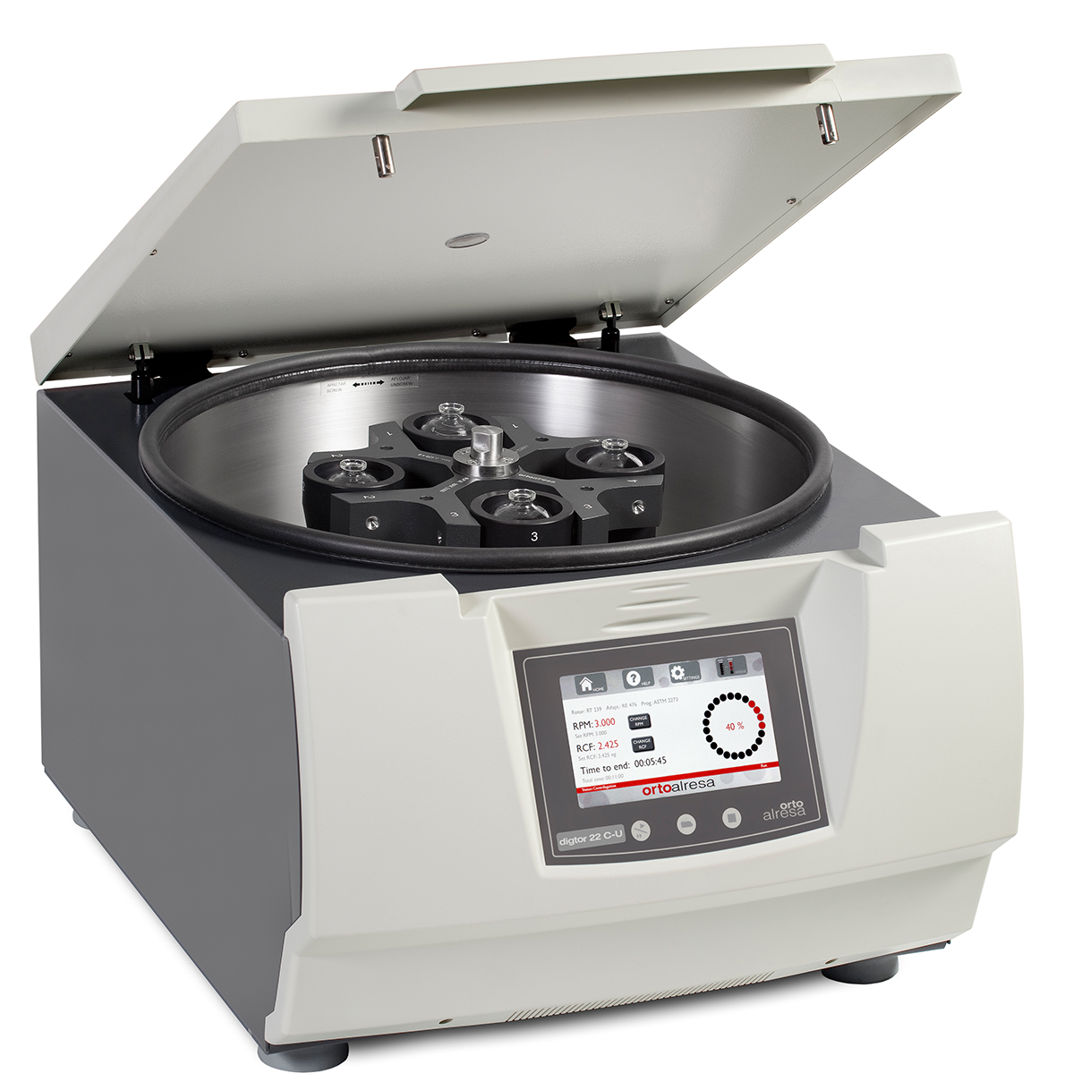 The Digtor 22 C Series oil centrifuge is designed for oil and petrol applications, adhering to ASTM, API, ISO, and other industry standards. It supports a max capacity of 4 x 100 ml tubes and operates at speeds up to 3,000 RPM (2,425 xg). Features include a TFT color touchscreen, programmable settings, and an optional Gas Release System (GRS).