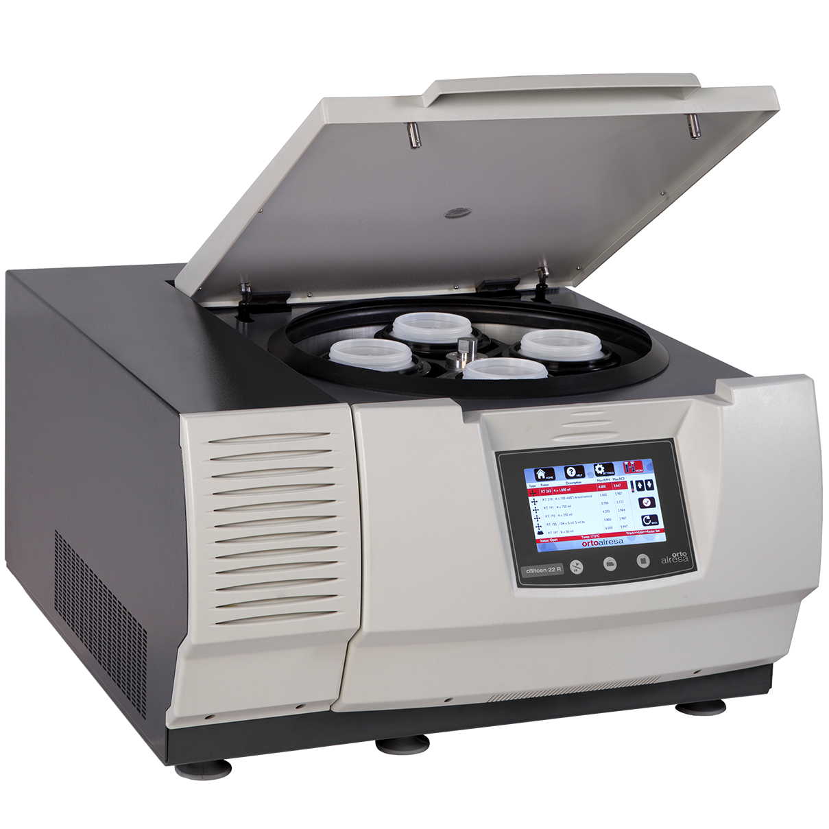 The largest of our benchtop machines, with a 4-litre capacity, features an ergonomic design for easy rotor loading and sample positioning, ensuring balanced loads and easy identification. It accommodates a variety of accessories, including four 1,000 ml bottles, microplates, and tubes (15 ml, 50 ml, and 10 ml) for clinical and biotechnology applications. The TFT color touch screen allows for operational control, data export, and programmed timer functions, supporting automation and process traceability. With a refrigeration system, it maintains chamber temperatures below 4°C, regardless of rotor type or speed, ensuring reliable performance and process control.