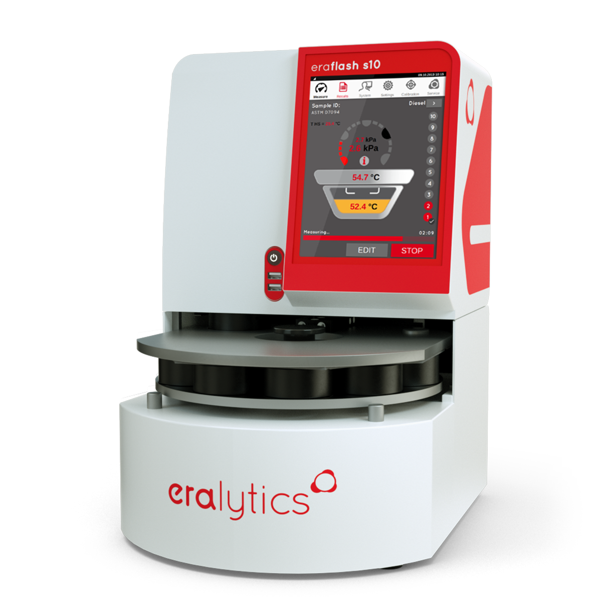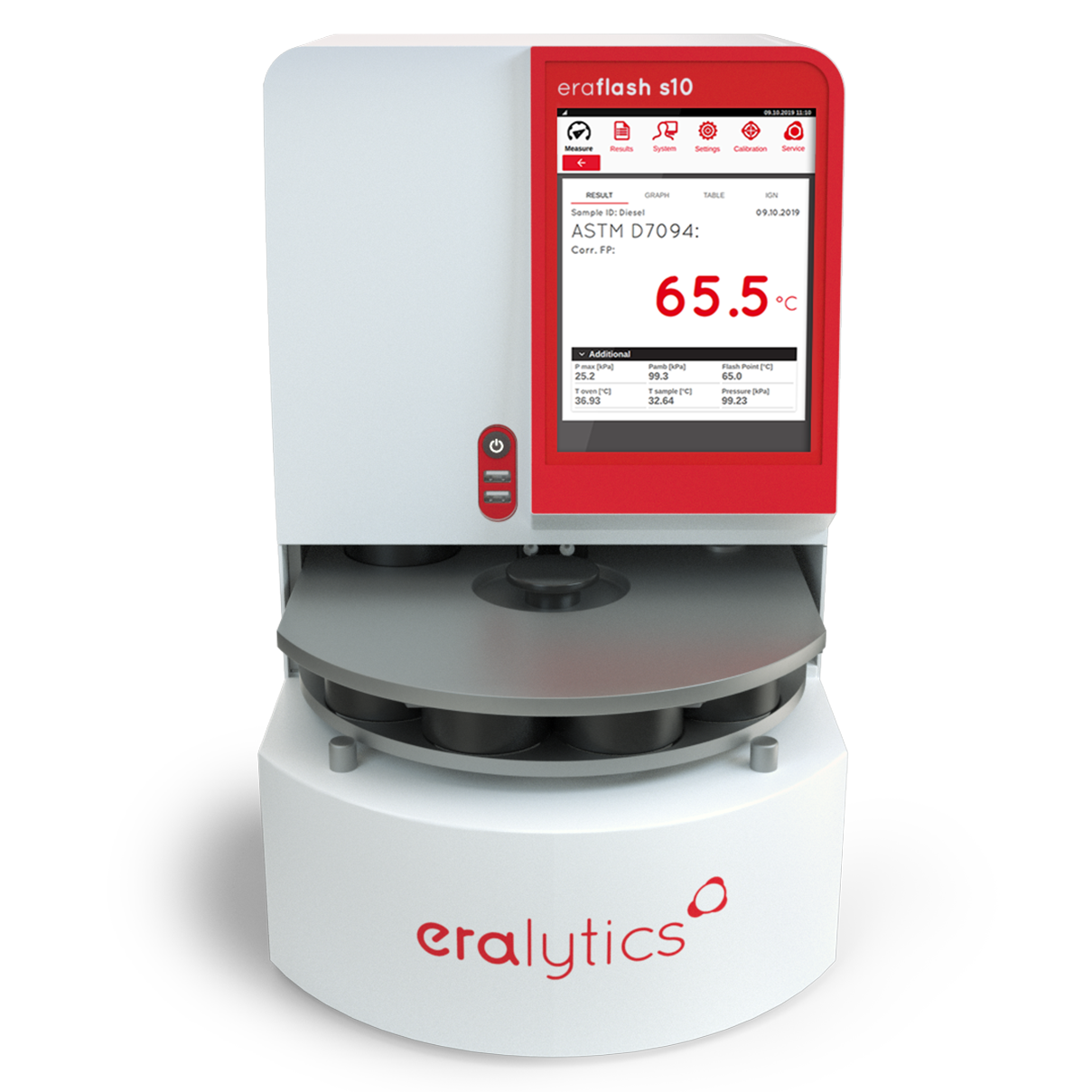 The flash point tester ERAFLASH S10 combines the safest measurement with a 10-position autosampler and measures in full compliance with the Continuously Closed Cup flash point testing methods ASTM D6450, ASTM D7094 as well as the European equivalent IP620. ASTM D7094 shows no statistical bias to the former ASTM D93 Pensky Martens method. The sample volume is only 2 ml. During measurements an electric arc ignites the sample vapor and the analyzer determines the flash point by the pressure change inside the closed cup. Flash point testing never was safer and easier.