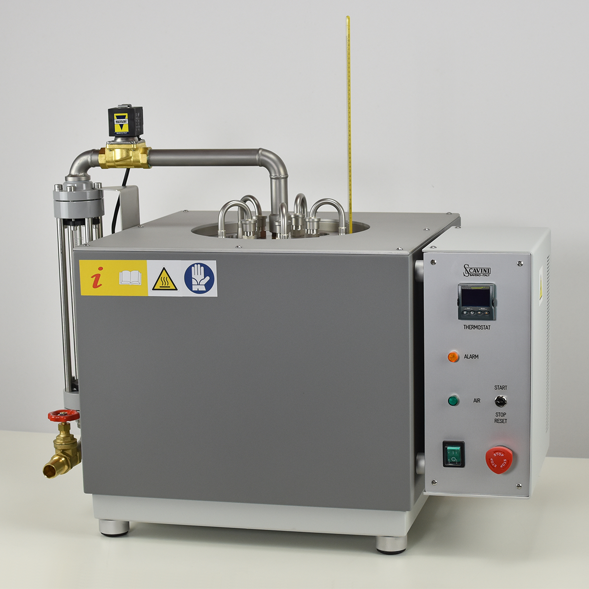 The apparatus for the determination of existent gum in fuels by jet evaporation (ASTM D 381 – IP 131 – ISO 6246) is a reliable and efficient tool for testing gasoline. It is available in two versions: one for the “Air Jet” test and another for both the “Air and Steam Jet” tests, which includes a built-in steam superheater. The apparatus features a robust benchtop steel case with a heating block, steam generator, and air blower. It includes a high-precision flowmeter, stainless steel gauge, and microprocessor thermoregulator with a digital display for accurate temperature control. With a CE mark and user manual, this apparatus is designed for easy operation and reliable performance.