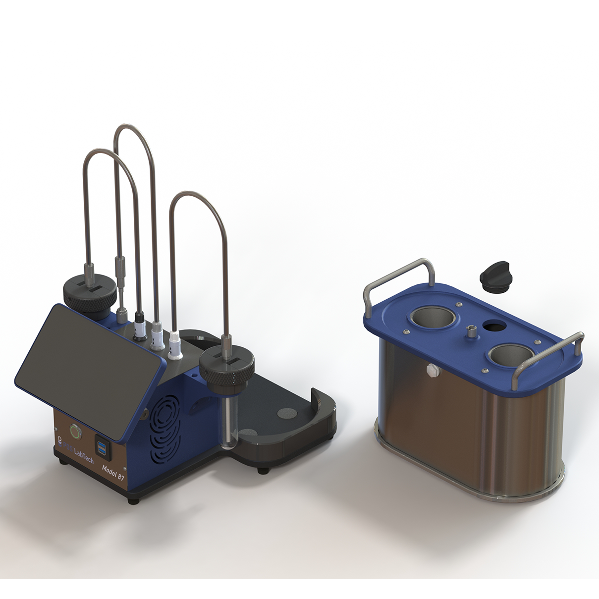 The LabTech Model 87 is a fully automated instrument for determining the melting point of petroleum, paraffin, or scale wax using the cooling curve method, in compliance with ASTM D87. It features dual test cells in a removable bath for higher throughput and calibrated RTD probes, eliminating the need for mercury thermometers. The system is fully automated, from sample insertion to results, and offers a simple touchscreen interface with visual and audible test status indicators. Results can be stored and exported via USB ports. The included wireless keyboard with touchpad enhances ease of use, and the system reduces operator variability, providing an economical and efficient solution for wax melting point testing.