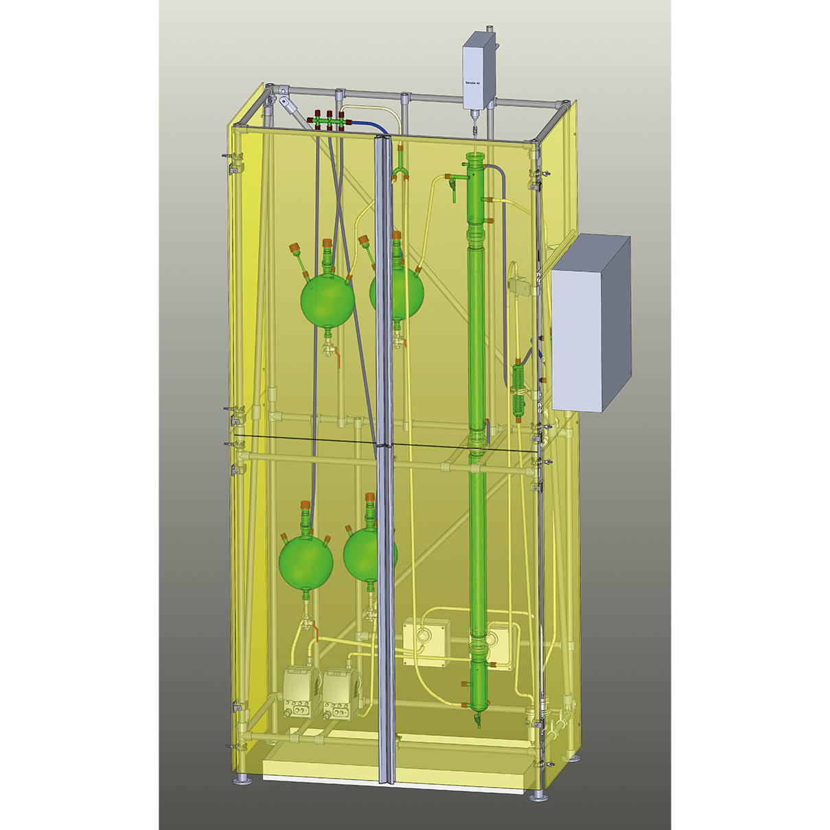 The feed streams are controlled by two adjustable feed pumps. The product withdrawal is managed by two overflow systems, whereby the adjustable height of the heavy phase discharge line is controlling the location of the main phase boundary inside the column. This allows the operator’s choice, whether the heavy or the light phase should be used as the dispersed phase.