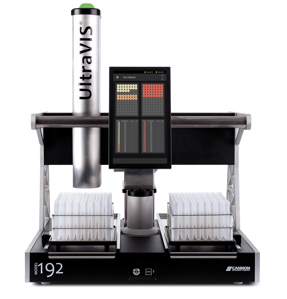 UltraVIS 192 is a fully automated, high speed, solvent-free viscometer for rapid kinematic viscosity measurement of transparent and opaque liquids. A 192-position sample handler (two 96-position trays) allows unattended processing of up to 24 samples per hour. The fast-run tubes cover a viscosity range of 5 to 50 mm2/s (cSt) at 100 °C and 30 to 680 mm2/s (cSt) at 40 °C (40 °C viscometer tube range is 30 to 300 mm2/s but viscosity may be measured up to 680 cSt).